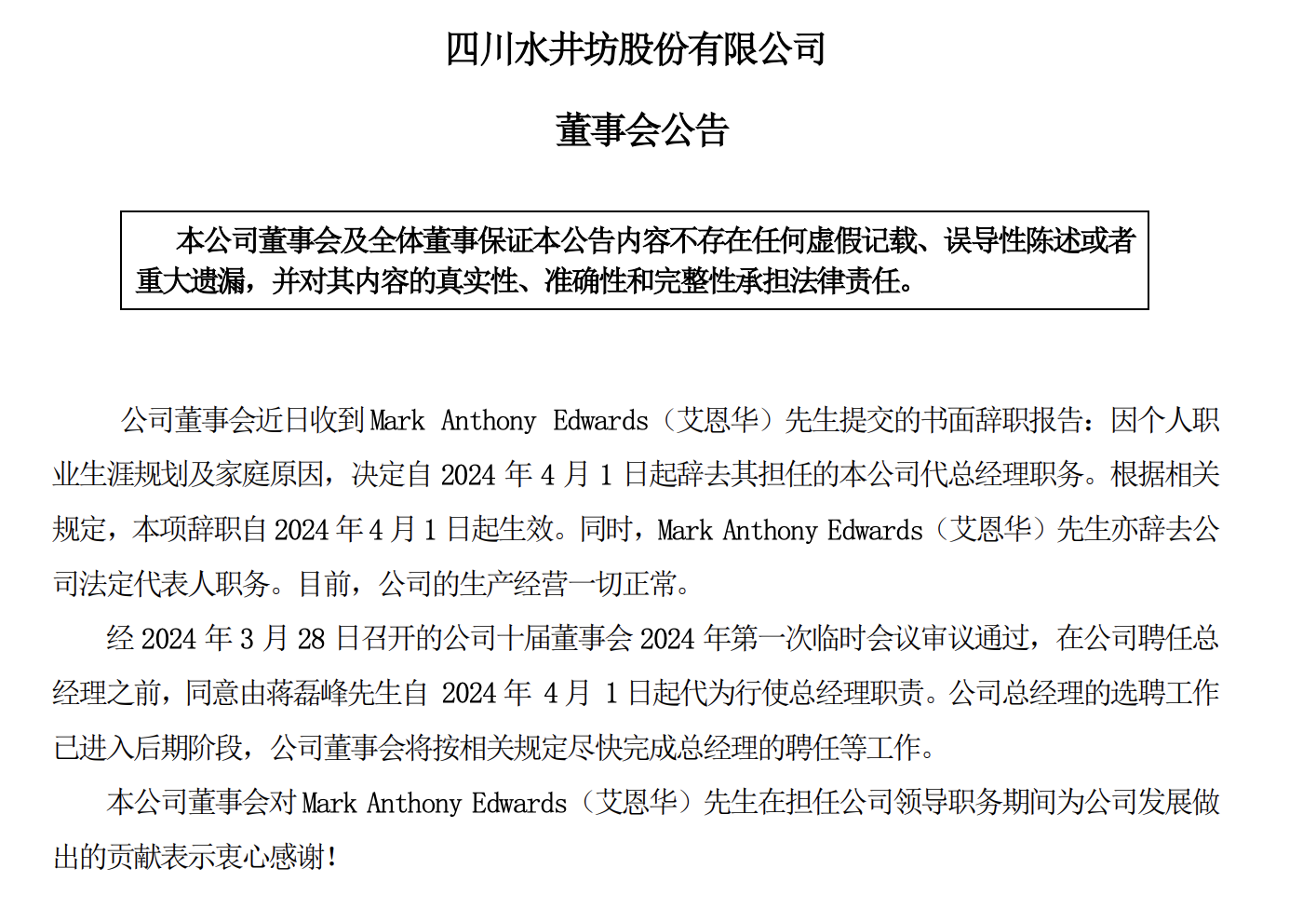 近日,水井坊发布公告,鉴于Mark Anthony Edwards(艾恩华)因个人职业生涯规划及家庭原因辞去代总经理职务,同意由蒋磊峰自2024年4月1日起代为行使总经理职责。同时,艾恩华亦辞去水井坊法定代表人职务。水井坊表示,目前公司生产经营一切正常。