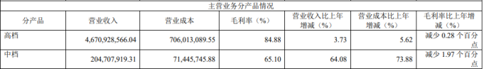 去年高档产品营收增速远低于中档产品