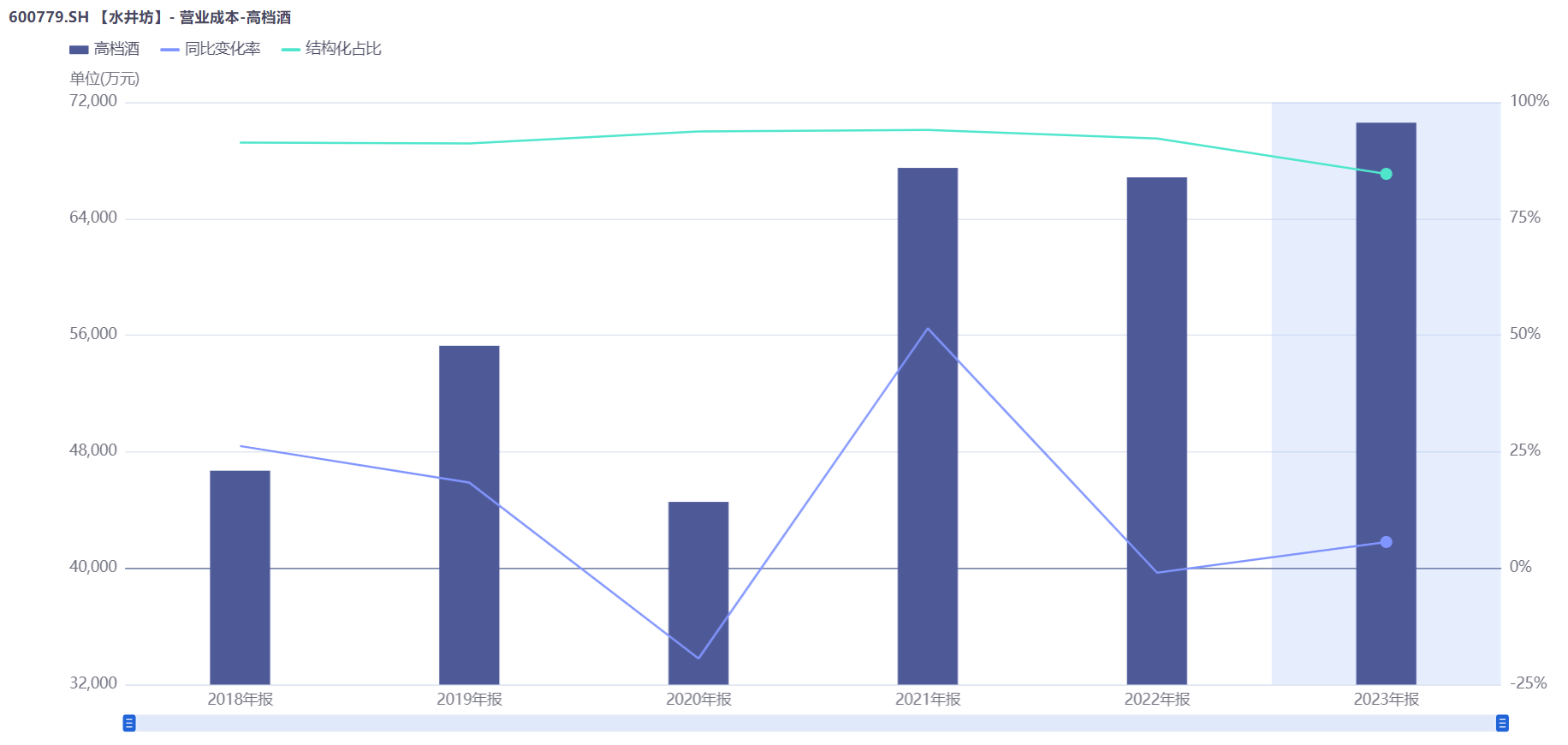 根据水井坊发布的2023年财报数据,水井坊品牌系列的高端产品实现营业收入46.71亿元,同比增长3.73%,相比2021年的54.33%显著放缓。同时,以天号陈系列酒为代表的中档产品收入达到2.05亿元,同比增长64.08%。