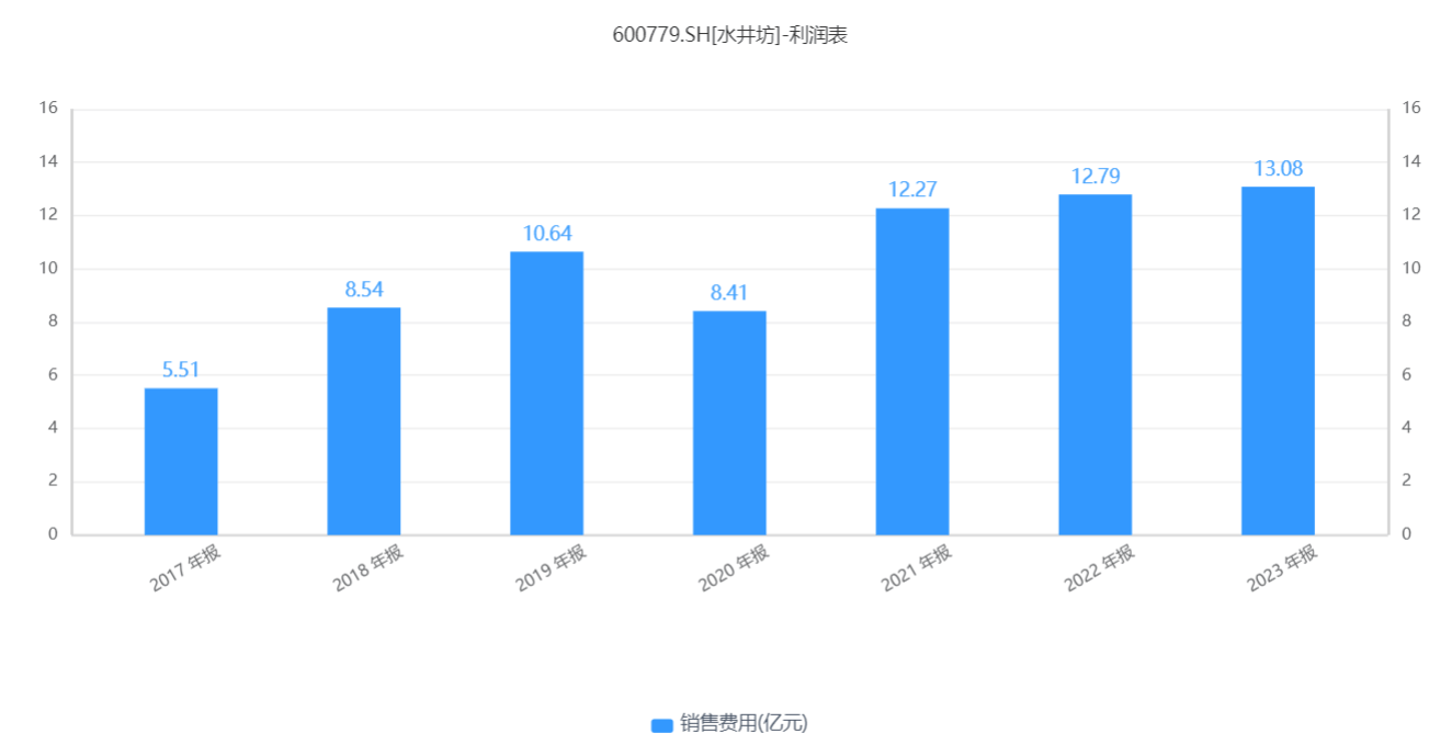在营销领域的显著投入,直接导致了销售费用的显著增长。根据财报数据显示,从2017年至2023年,水井坊的销售费用支出分别为5.51亿元、8.54亿元、10.64亿元、8.41亿元、12.27亿元、12.79亿元和13.08亿元。同时,这些销售费用在营业收入中的占比大致在三成左右,分别为26.88%、30.3%、30.08%、27.97%、26.48%、27.37%和26.40%。