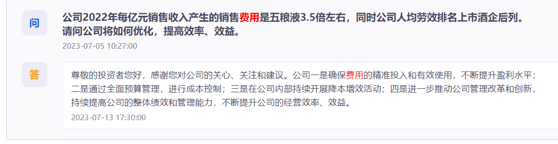 对于高销售费用的质疑,水井坊曾在投资者平台上回复表示:“公司一是确保费用的精准投入和有效使用,不断提升盈利水平;二是通过全面预算管理,进行成本控制;三是在公司内部持续开展降本增效活动;四是进一步推动公司管理改革和创新,持续提高公司的整体绩效和管理能力,不断提升公司的经营效率、效益。”