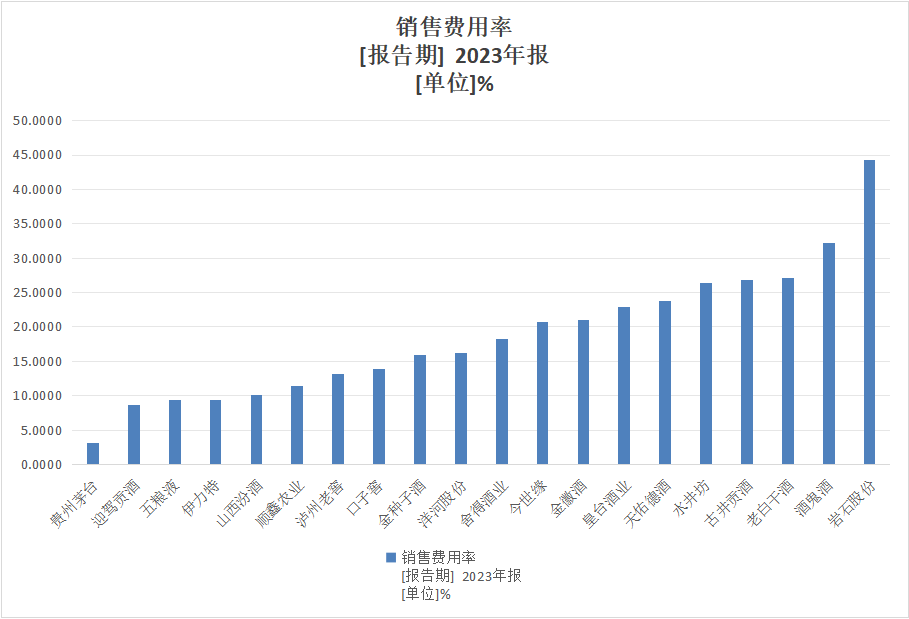对比行业,高端酒代表贵州茅台、五粮液其销售费用率普遍10%以下,2023年茅台销售费用46.49亿,所占营业收入比重为3.09%;2023年五粮液的销售费用为77.96亿元,所占营业收入比重为9.36%。