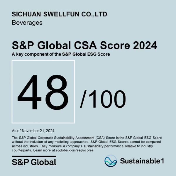在24年标普全球(S&P Global)企业可持续发展评分中,水井坊成绩相比去年有所提升,超越了79%的全球同行业受评企业。标普全球(S&P Global)作为全球最具权威性的企业可持续发展实践年度评估之一,致力于通过严格的评分标准把公司的可持续发展表现与其商业战略相关联,再将企业在环境、社会、公司治理这三大维度下的各项相关议题的信息披露状况及绩效表现进行量化评分,从而全面展现企业的可持续发展管理水平。在这次评估结果中,水井坊ESG管理水平的综合评估分数为48分,较去年再提升17%,特别是在公司治理和社会领域的评分对比去年有大幅度提升,并且在7项议题中保持行业领先地位。同时,水井坊还在今年获得标普全球可持续发展“行业最佳进步企业”称号,这是对水井坊在可持续发展方面努力的极大肯定。