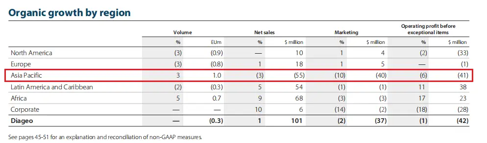 财报显示,报告期内,亚太市场贡献了19%的销售额,估算约为20.71亿美元,是帝亚吉欧的第三大区域市场,同期销量增长了3%。