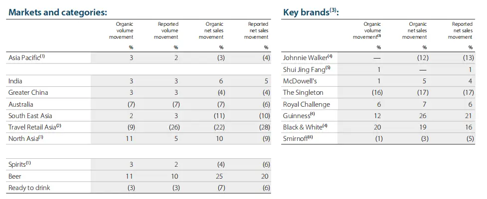 分产品来看,亚太地区烈酒净销售额下降 4%,原因是苏格兰威士忌表现疲软,尤其是尊尼获加(Johnnie Walker)在报告期内下滑了12%。