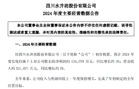 水井坊发布2024年度主要经营数据公告,预计2024年度实现净利润约13.41亿元,同比增长约6%;营业收入约52.17亿元,同比增长约5%,完成年初制定的全年经营目标。