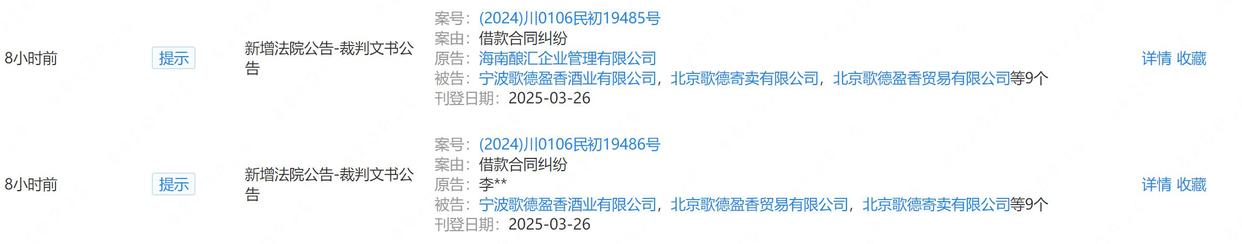 3月26日,宁波歌德盈香酒业有限公司(下述简称“歌德盈香”)新增一条裁判文书公告,案号为〔2024〕川0106民初19485号。