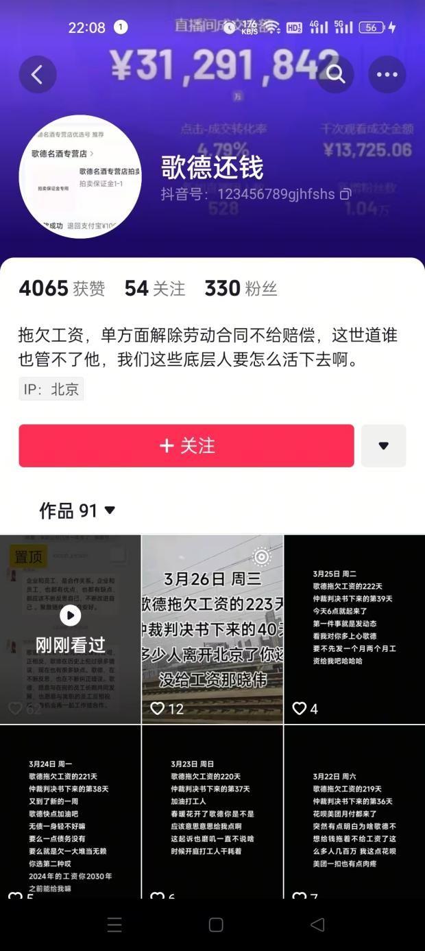 截至3月26日,歌德盈香欠薪的风波似乎还未能过去,在抖音等社交平台上,一位名叫“歌德还钱”的博主,在3月26日仍旧发布视频称“歌德拖欠工资的223天,仲裁判决书下来的40天,多少人离开北京了你还没给工资。”
