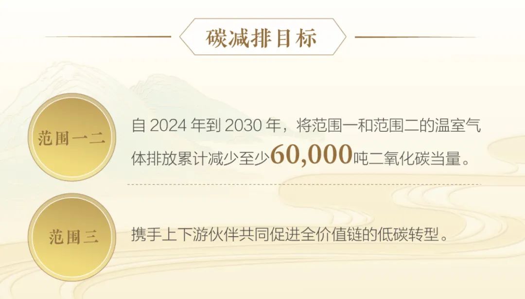 据水井坊发布的《2024 环境、社会及公司治理(ESG)报告》,水井坊计划自2024年至2030年,累计减少范围一和范围二温室气体至少6万吨二氧化碳当量;同时,通过深化与上下游伙伴合作,推动范围三的全面低碳转型。这一目标的制定不仅契合国际气候行动趋势,更标志着水井坊将减排责任从自身运营延伸至全产业链。这一目标的制定不仅契合国际气候行动趋势,更标志着水井坊将减排责任从自身运营延伸至全产业链。
