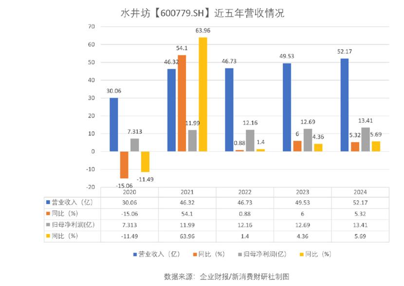 在这样的行业大背景下,水井坊 2024 年的业绩呈现喜忧参半的局面。财报显示,公司全年营收52.17亿元,同比增长5.32%;净利润13.41亿元,同比增长5.69%。