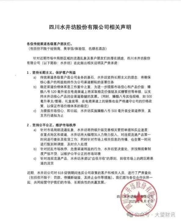 据每日经济新闻等媒体报道,7月8日,《四川水井坊股份有限公司相关声明》发布,具体内容包括“臻酿八号500毫升装全渠道停货”、“臻酿八号520毫升装在电商渠道将采取稳价值链及买赠管控等举措”。