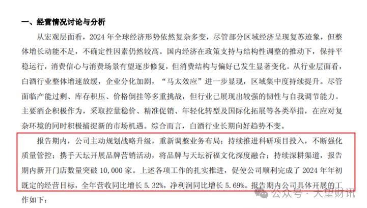 水井坊表示,报告期内,公司主动规划战略升级,重新调整业务布局,持续推进科研项目投入,不断强化质量管控,深耕销售渠道等。上述各项工作的扎实推进,帮助其完成了2024年年初既定的“主营业务收入和净利润均保持增长”经营目标。