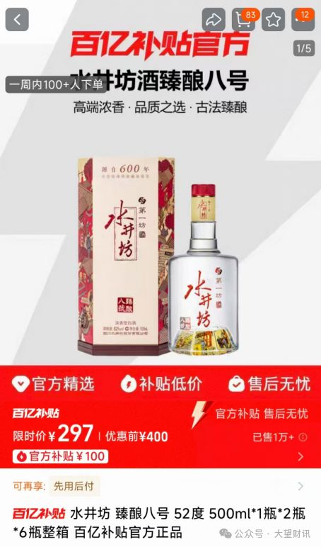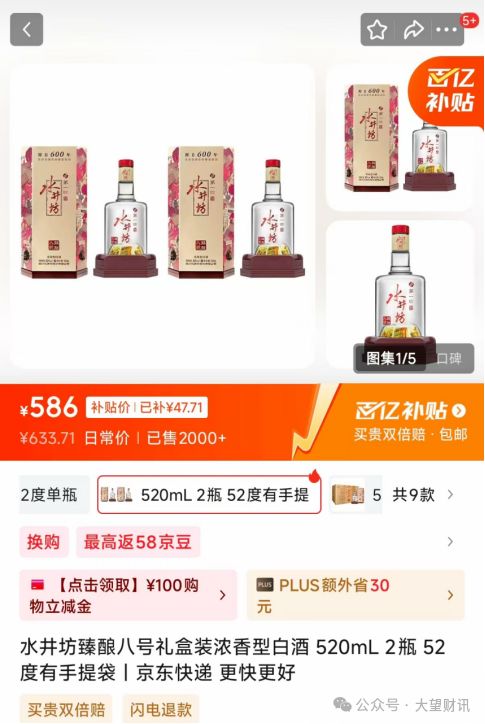 在这一行业乱局中,水井坊也未能幸免。以水井坊的核心大单品臻酿八号为例,在淘宝平台上,补贴过后的臻酿八号水井坊500ml52度价格仅有297元,这一价格与官方指导价428元相比,跌幅超过了30%。在京东平台上,还可以看到两瓶装臻酿八号水井坊500ml52度补贴价为586元,折合每瓶仅有293元。