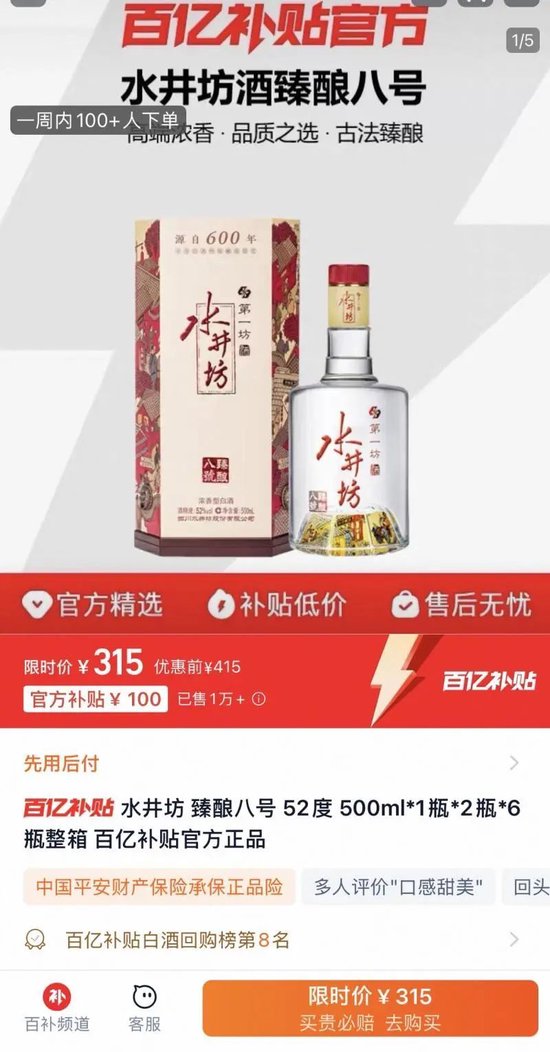 臻酿八号是水井坊的核心大单品,52度500ml规格的建议零售价为578元,但目前在电商平台,补贴过后的52度500ml臻酿八号价格仅为315元,低于指导价二百多元。