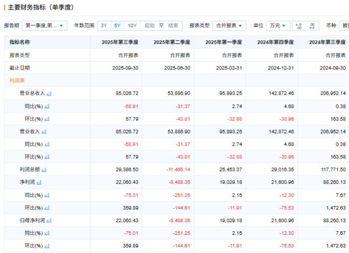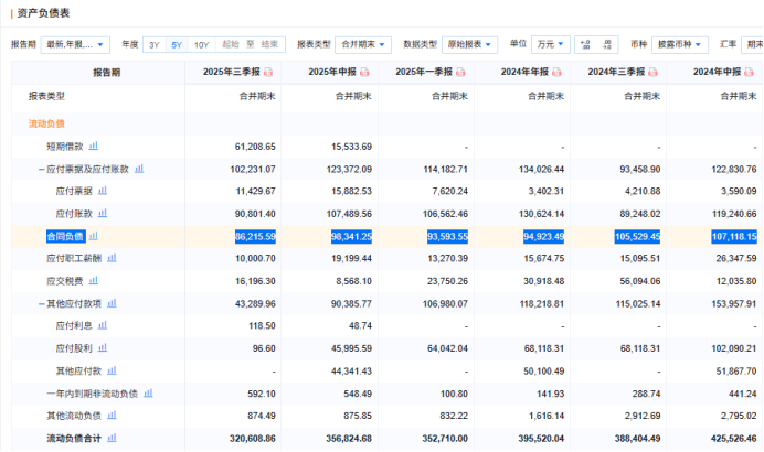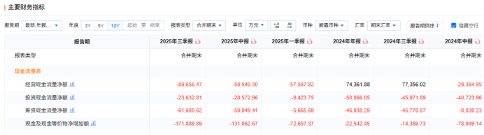 现金流的持续恶化是最直接的体现。根据公司现金流量表数据,2025年前三季度,公司经营活动现金流净额为-8.67亿元,同比由正转负,暴跌212.02%;投资活动现金流净额为-2.36亿元,筹资活动现金流净额为-6.16亿元,现金流净流出意味着公司资金持续消耗。