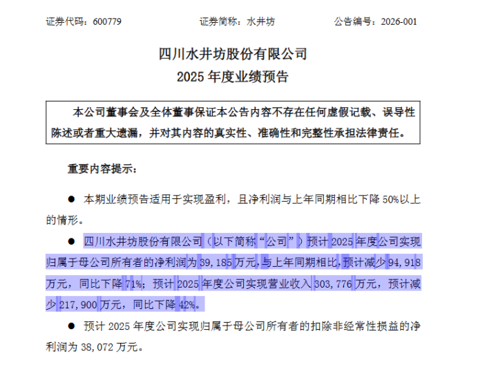 2026年1月20日,四川水井坊股份有限公司(600779.SH,以下简称“水井坊”)发布2025年度业绩预告,一份堪称“腰斩式”的业绩答卷引发市场震动。预告显示,公司2025年度预计实现归属于母公司所有者的净利润39185万元,较上年同期减少94918万元,同比暴跌71%;营业收入预计为303776万元,较上年同期减少217900万元,同比下降42%。