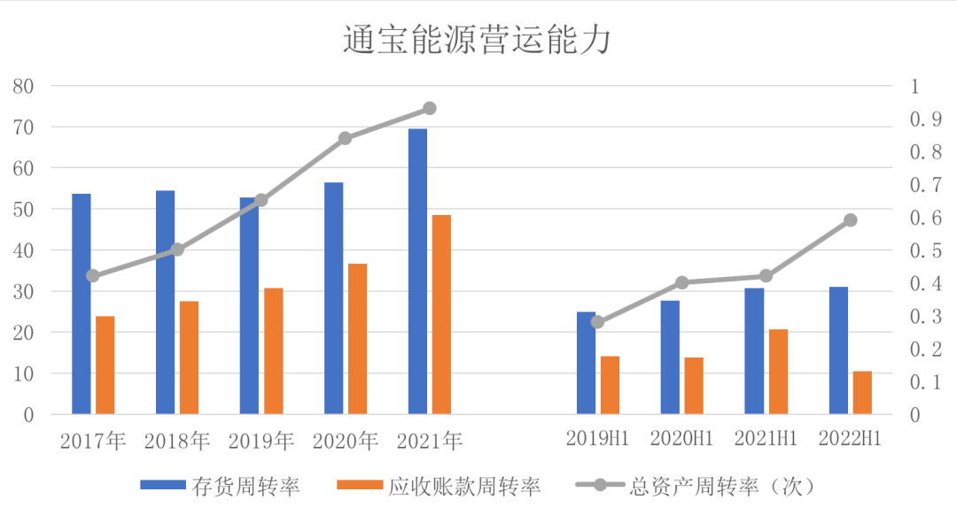 从半年报来看,2019年至2022年上半年,通宝能源的存货周转率分别为24.91、27.61、30.68、31.00,2022年上半年公司存货周转率较2021年同期相比有所上升。应收账款周转率分别为14.11、13.88、20.60、10.44,2022年上半年公司应收账款周转率较2021年同期相比有所下降。总资产周转率分别为0.28、0.40、0.42、0.59,2022年上半年公司总资产周转率较2021年同期相比有所上升。