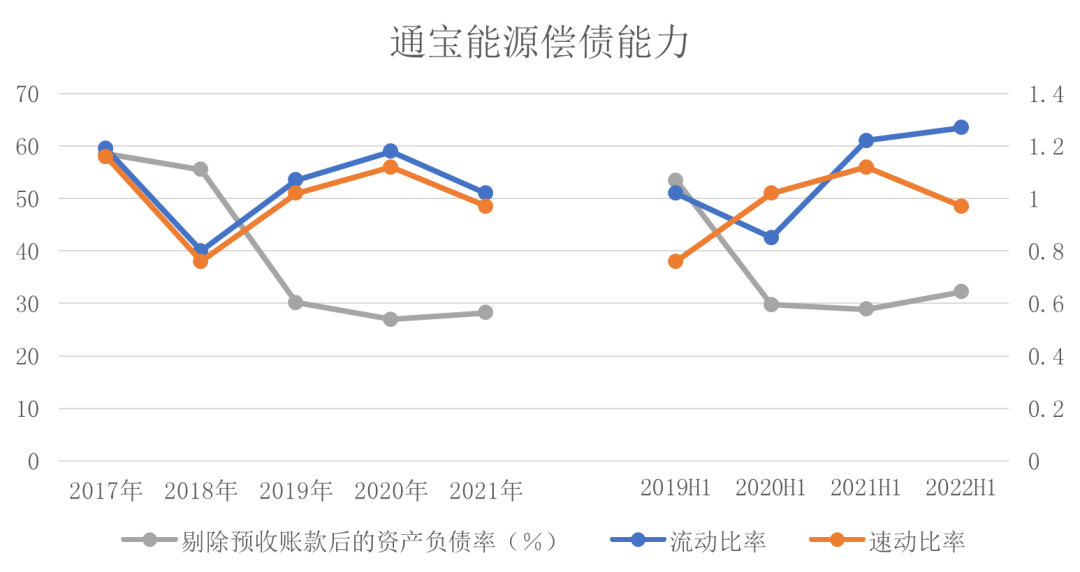 从半年报来看,2019年至2022年上半年,通宝能源的流动比率分别为1.02、0.85、1.22、1.27,2022年上半年公司流动比率较2021年同期相比有所上升。速动比率分别为0.76、1.02、1.12、0.97,2022年上半年公司速动比率较2021年同期相比下降。剔除预收账款后的资产负债率分别为53.42%、29.77%、28.88%、32.19%,2022年上半年公司剔除预收账款后的资产负债率较2021年同期相比有所上升。