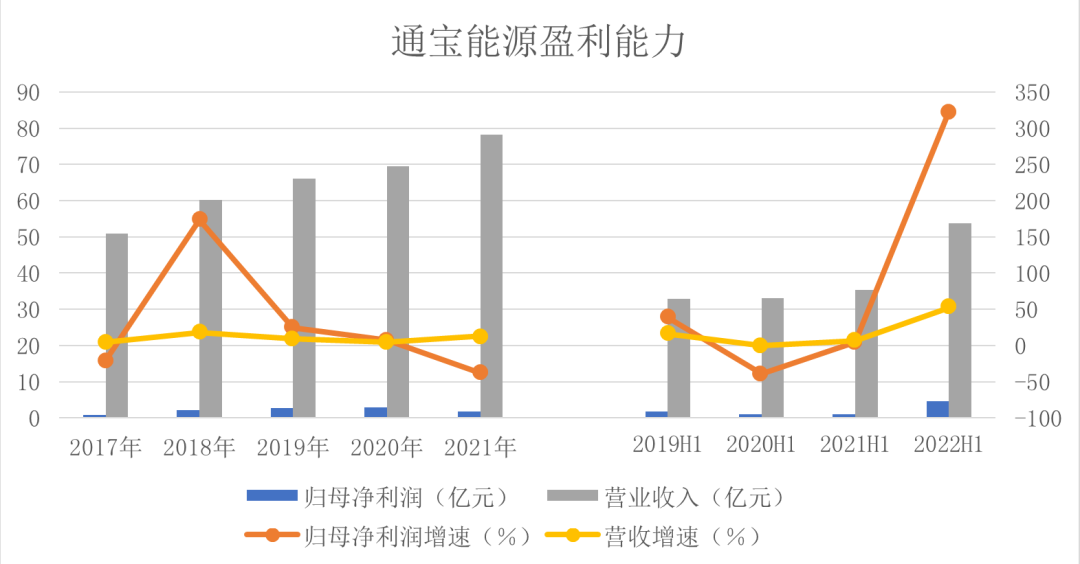 从半年报来看,2019年至2022年上半年,通宝能源的归母净利润分别为1.71亿元、1.04亿元、1.08亿元、4.57亿元,2022年上半年公司归母净利润较2021年同期相比有所上升。归母净利润增速分别为39.07%、-39.32%、4.39%、322.82%,2022年上半年公司归母净利润增速较2021年同期相比有所上升。营业收入分别为32.97亿元、33.08亿元、35.26亿元、53.79亿元,2022年上半年公司营业收入较2021年同期相比有所上升。营收增速分别为16.22%、0.35%、6.59%、52.54%,2022年上半年公司营收增速较2021年同期相比有所上升。