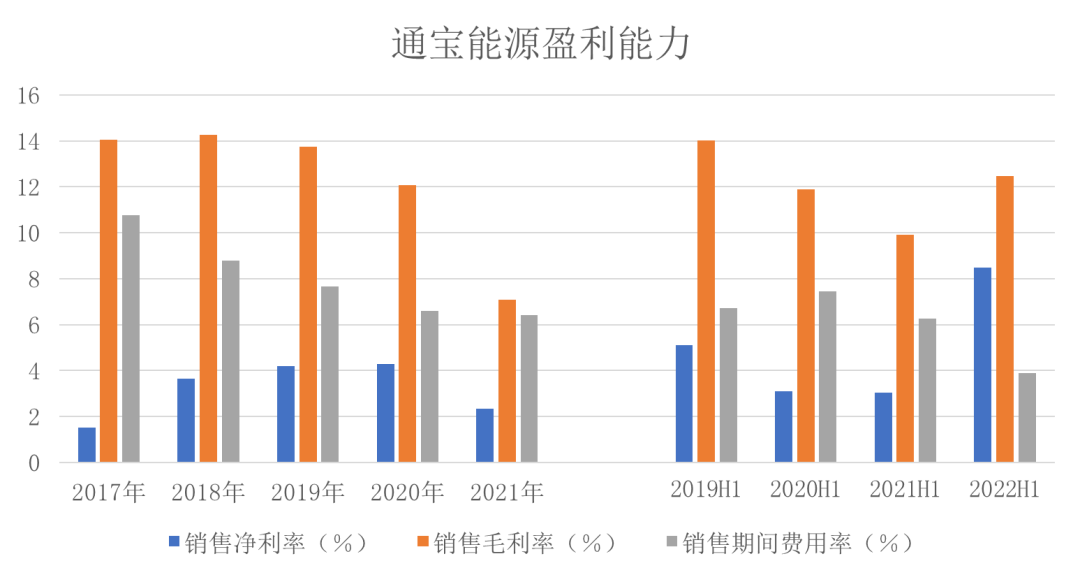 从半年报来看,2019年至2022年上半年,通宝能源的销售净利率分别为5.12%、3.10%、3.04%、8.48%,2022年上半年公司销售净利率较2021年同期相比有所上升。销售毛利率分别为14.01%、11.90%、9.9%、12.47%,2022年上半年公司销售毛利率较2021年同期相比有所上升。销售期间费用率分别为6.73%、7.45%、6.25%、3.88%,2022年上半年公司销售期间费用率较2021年同期相比有所下降。