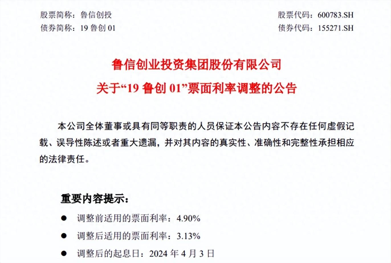 2月21日,鲁信创业投资集团股份有限公司(下称“鲁信创投”)披露关于“19鲁创01”票面利率调整的公告称,根据《鲁信创投2019年面向合格投资者公开发行公司债券(第一期)募集说明书》中关于调整票面利率选择权的约定,公司有权决定在2019年面向合格投资者公开发行公司债券(第一期)(下称“本期债券”或“19鲁创01”)存续期的第5个计息年度末调整本期债券存续期后5个计息年度的票面利率。根据公司实际情况及当前市场环境,公司决定将本期债券后5年的票面利率下调177个基点,即2024年4月3日至2029年4月2日本期债券的票面利率为3.13%。