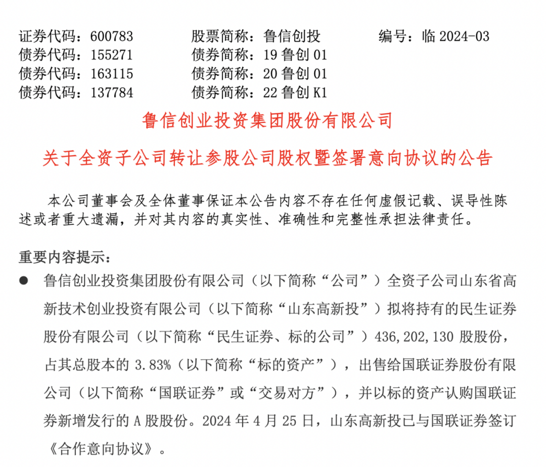 4月25日晚间,鲁信创投(600783,SH)发布公告称,全资子公司山东省高新技术创业投资有限公司(下称“山东高新投”)拟将持有的民生证券4.36亿股股份(占总股本的3.83%,下称“标的资产”)出售给国联证券,并以标的资产认购国联证券新增发行的A股股份。4月25日,山东高新投已与国联证券签订《合作意向协议》。受此影响,鲁信创投开盘后不久即涨停。