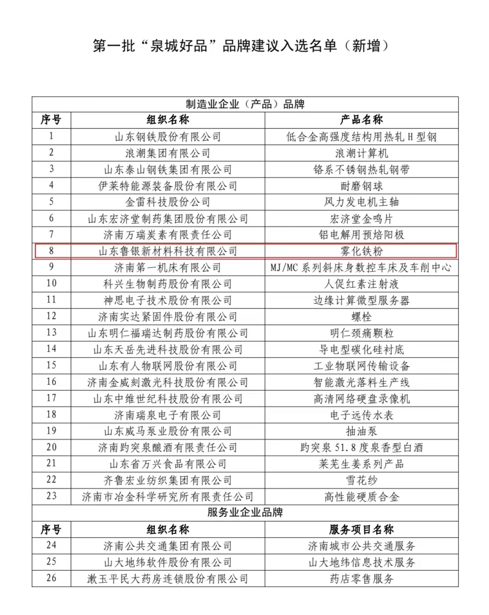 近期,济南市质量强市及品牌战略推进工作领导小组办公室发布《济南市质量强市及品牌战略推进工作领导小组办公室关于第一批“泉城好品”品牌建议入选名单的公示》,其中,鲁银新材雾化铁粉入选第一批“泉城好品”品牌建议入选名单。