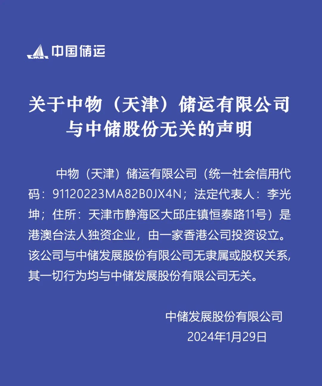 关于中物(天津)储运有限公司与中储股份无关的声明