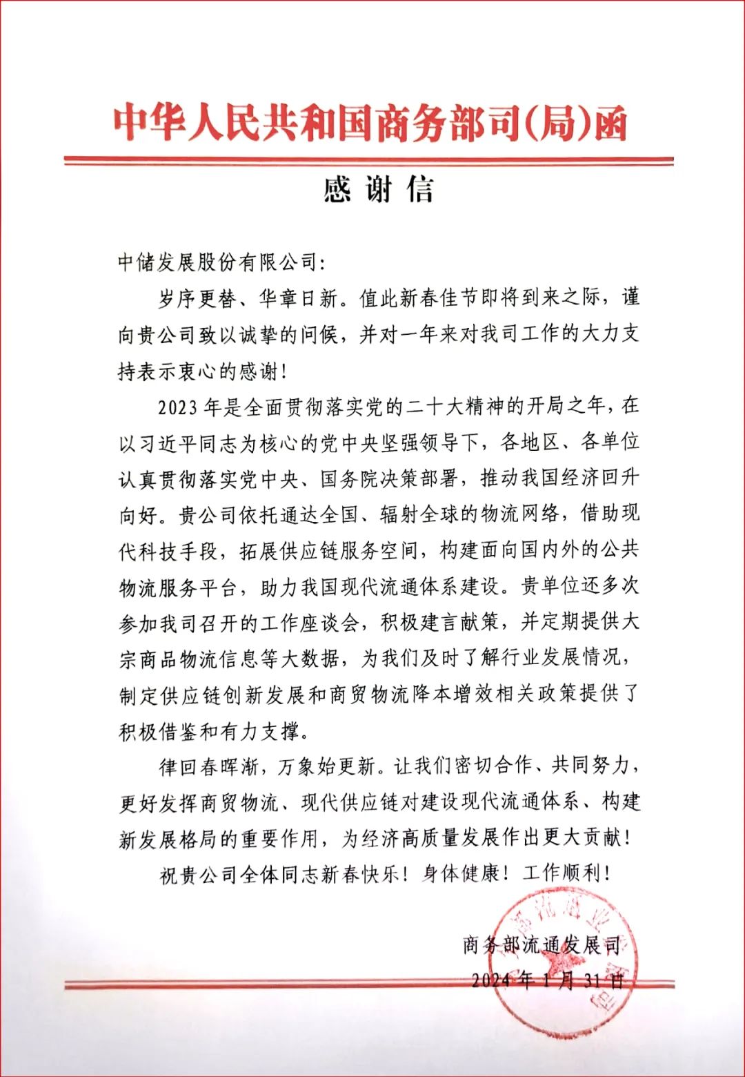 近日,中储股份收到一封来自国家商务部的感谢信,信中对中储股份给予商务部工作的支持表示感谢和赞许。