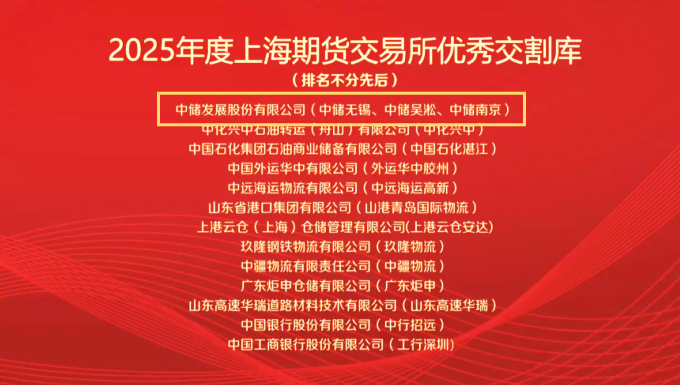 12月25日,上海期货交易所(以下简称“上期所”)公布了2025年度指定交割仓库评级结果,中储股份所属三家交割库凭借卓越的综合服务能力、规范高效的运营管理体系以及高度的合规诚信意识,成功获得“2025年度上海期货交易所优秀交割库”荣誉称号。