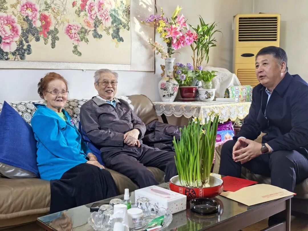 房永斌与两位老干部亲切交谈,细致询问了二老的日常生活起居,深入了解他们的身体、生活情况。桓玉珊作为中储老领导非常关心公司近年来的发展方向,回顾了64年来中储一路走过的奋斗历程。房永斌向他们介绍了中储“十四五”期间经营成绩,对他们往昔为公司发展所作出的卓越功绩表达诚挚谢意,并转交了国务院国资委党委的慰问信,转达了上级党委的关心问候和新春祝福。