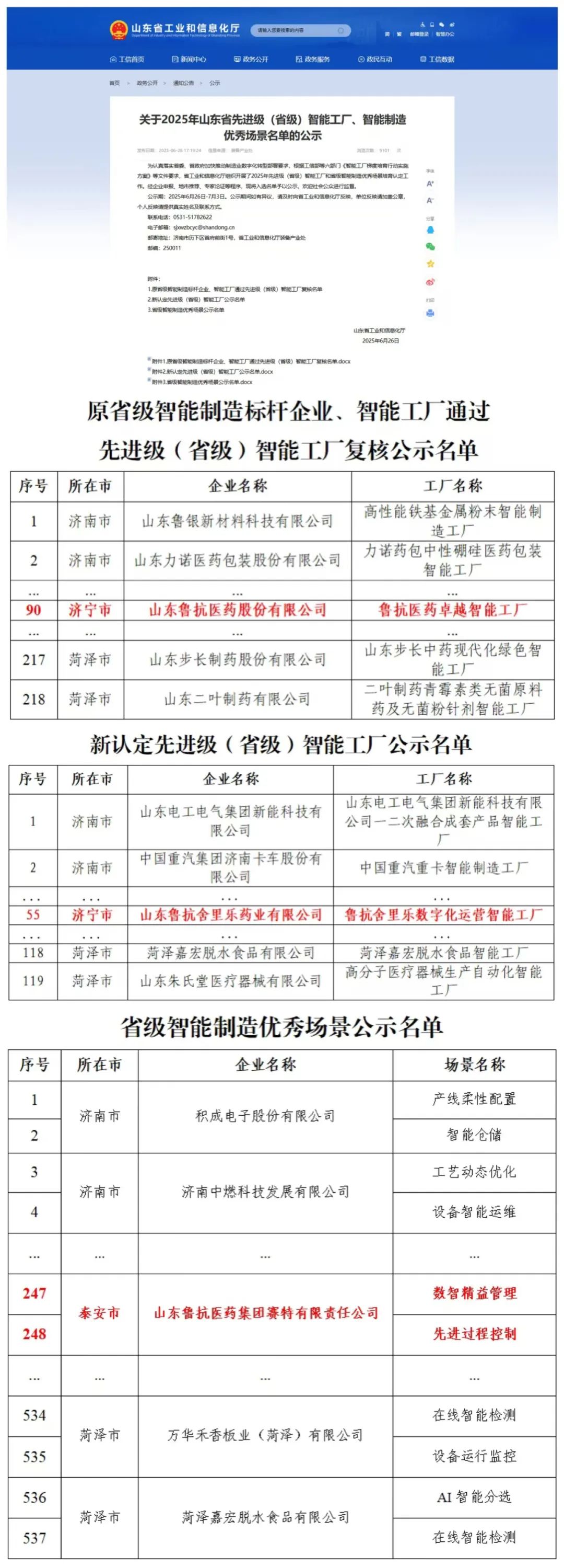 为认真落实省委、省政府加快推动制造业数字化转型部署要求,根据工信部等六部门《智能工厂梯度培育行动实施方案》等文件要求,省工业和信息化厅组织开展了2025年先进级(省级)智能工厂和省级智能制造优秀场景培育认定工作。山东鲁抗医药股份有限公司(以下简称“鲁抗医药”)申报的“鲁抗医药卓越智能工厂”与山东鲁抗舍里乐药业有限公司申报的“鲁抗舍里乐数字化运营智能工厂”,双双荣获先进级(省级)智能工厂称号。同时,山东鲁抗医药集团赛特有限责任公司获得“省级智能制造优秀场景”2个,分别为“数智精益管理”和“先进过程控制”。