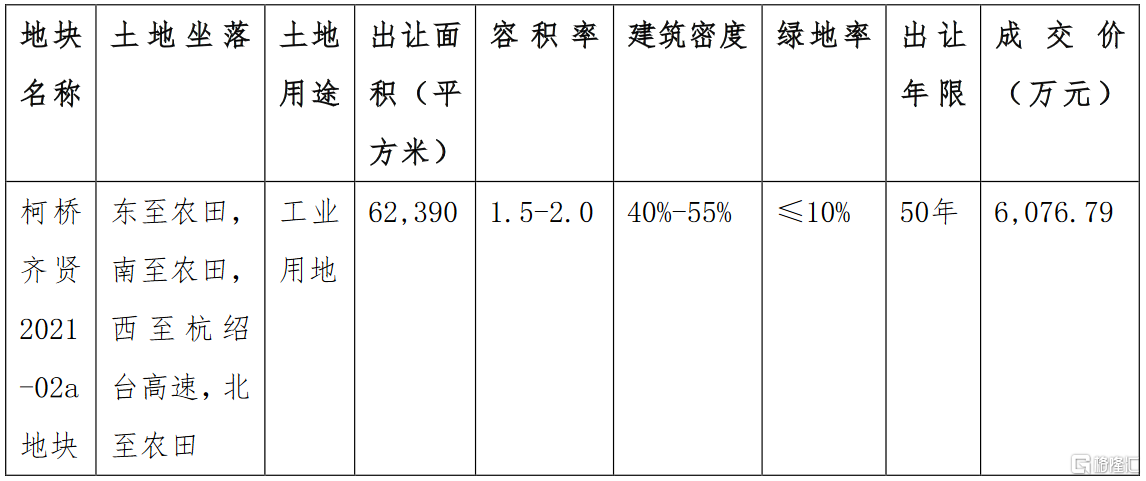 格隆汇10月10日丨轻纺城(600790.SH)公布,公司于近日参与了绍兴市自然资源和规划局委托绍兴市柯桥区公共资源交易中心组织的柯桥齐贤2021-02a地块网上公开出让活动,并与绍兴市自然资源和规划局、绍兴市柯桥区公共资源交易中心签订了《国有建设用地使用权出让网上交易成交确认书》,公司以6076.79万元竞得柯桥齐贤2021-02a地块的国有建设用地使用权。柯桥齐贤2021-02a地块基本情况如下表: