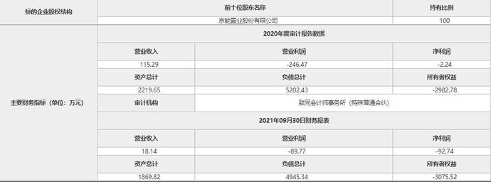 据悉,京能物业成立于2001年5月8日,注册资本1000万元;由京能置业持股100%;经营范围包括销售食品;零售烟草;餐饮服务(仅限分支机构经营);物业管理;酒店管理等。截至2021年9月30日,京能物业营业收入18.13万元,营业亏损89.77万元,净亏损92.74万元,资产总额1869.82万元,负债总额4945.34万元。