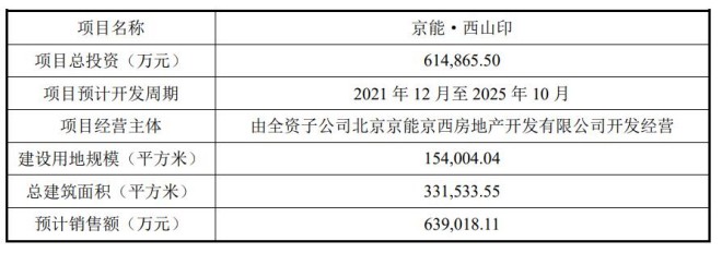 根据发行预案,“京能·西山印”项目是京能置业规模较大的重点建设项目。项目定位为共有产权房,预计开发周期从2021年12月至2025年10月,建设用地规模15.40万平方米,总建筑面积有33.15万平方米。