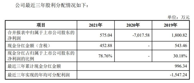 最近三年(2019年至2021年),京能置业累计现金分红996.34万元,不过实现年均可分配利润为-1547.24万元。