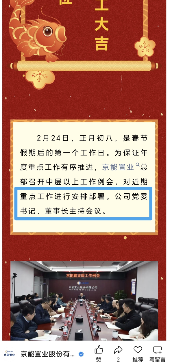 乐居财经吴文婷 2月24日,据京能置业官微,为保证年度重点工作有序推进,公司总部召开中层以上工作例会,对近期重点工作进行安排部署。