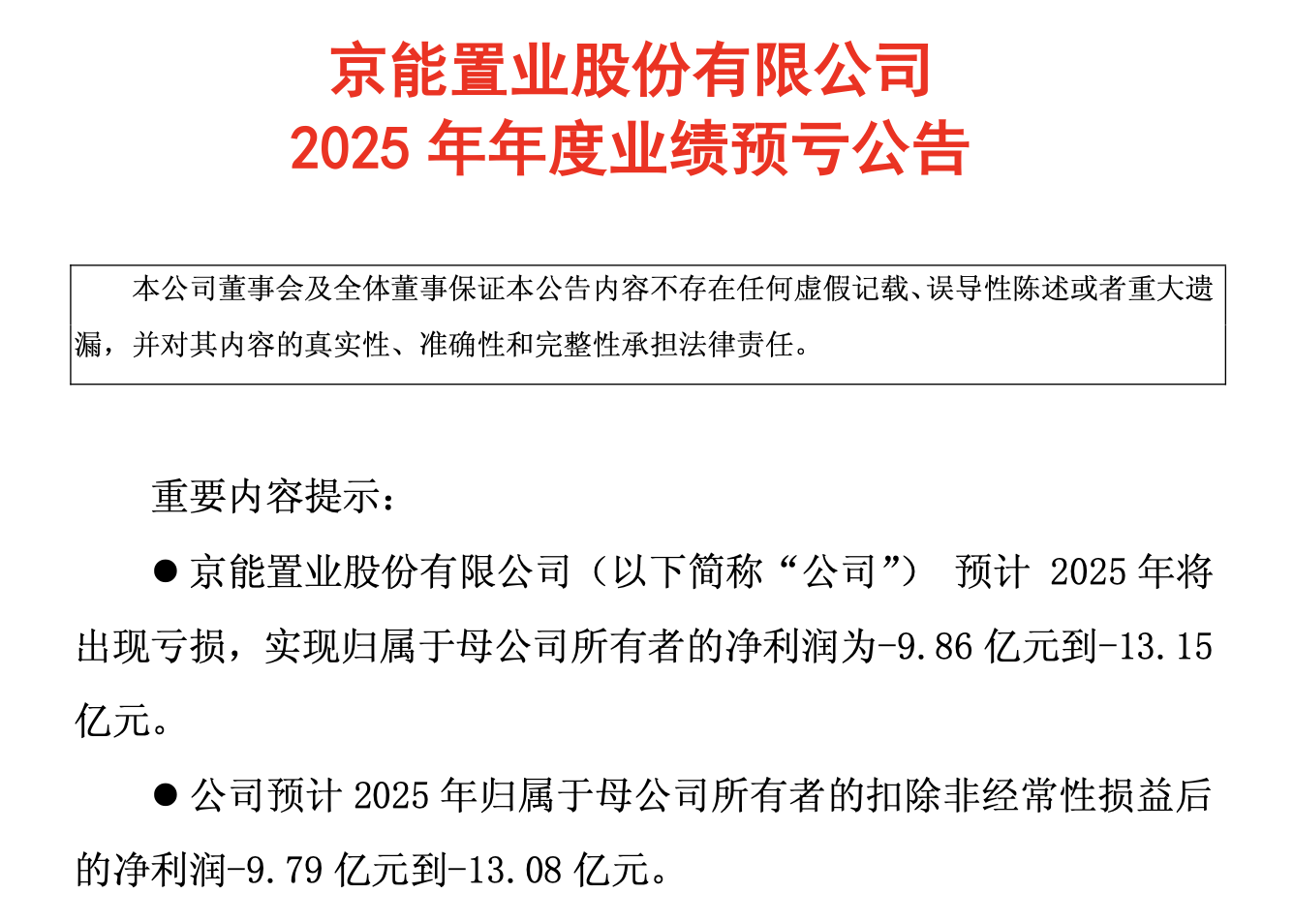 业绩方面,京能置业预计2025年将出现亏损,实现归属于母公司所有者的净利润为-9.86亿元到-13.15亿元。