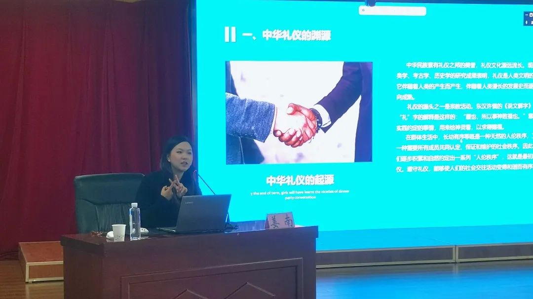 此次培训由昆明工业职业技术学院,现任职交通运输学院空中乘务专业教师姜南老师为大家讲授商务礼仪方面的知识培训。