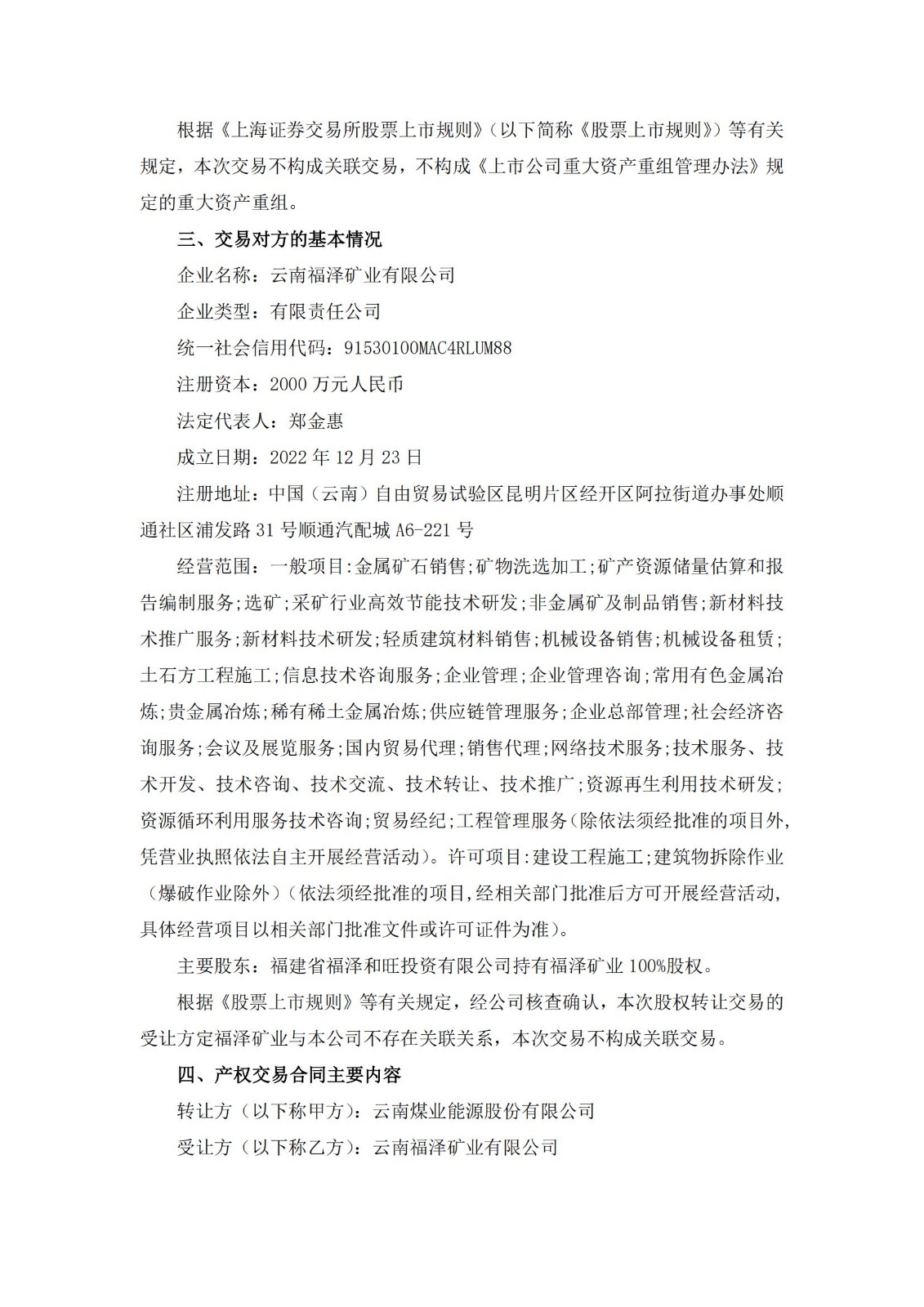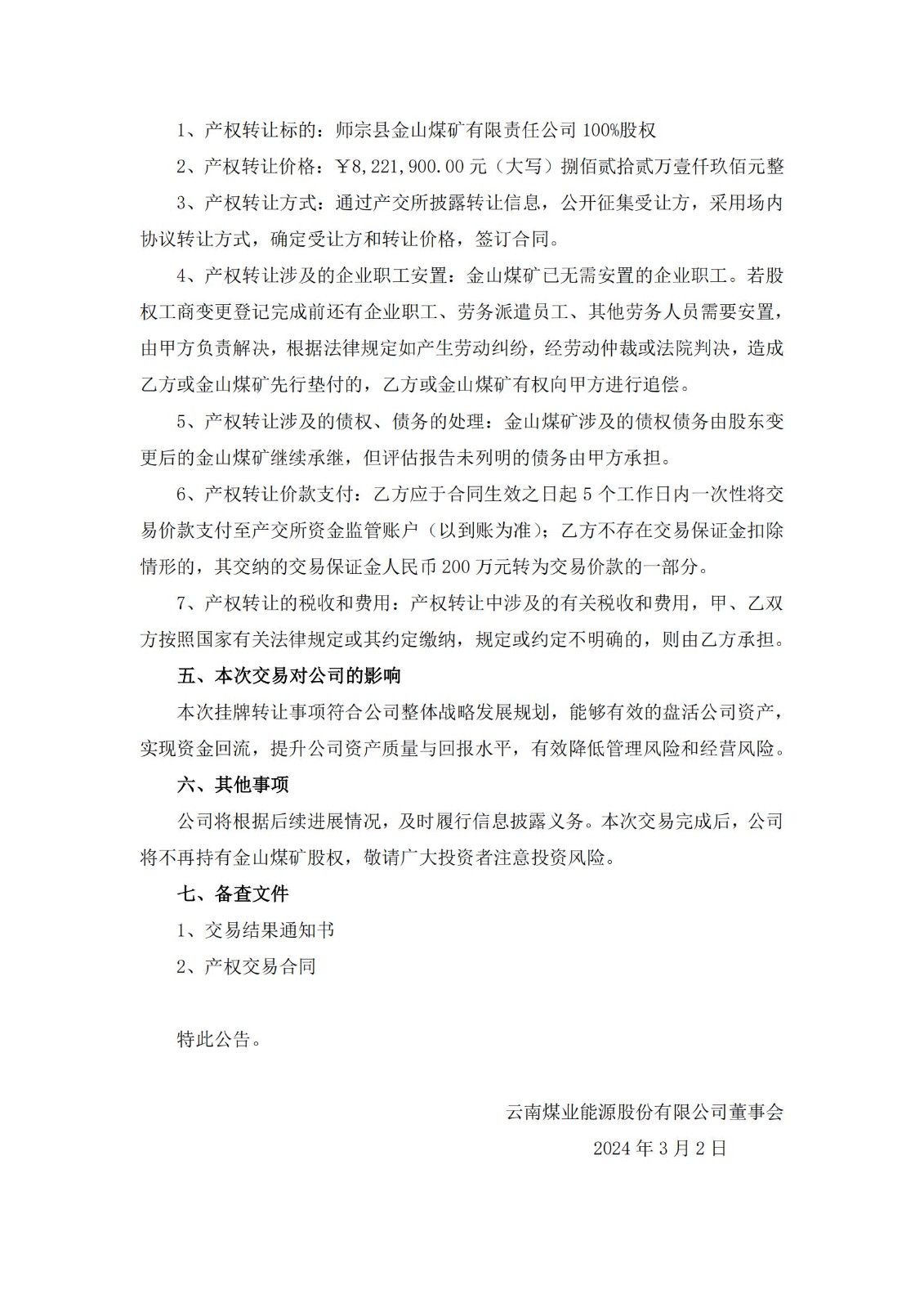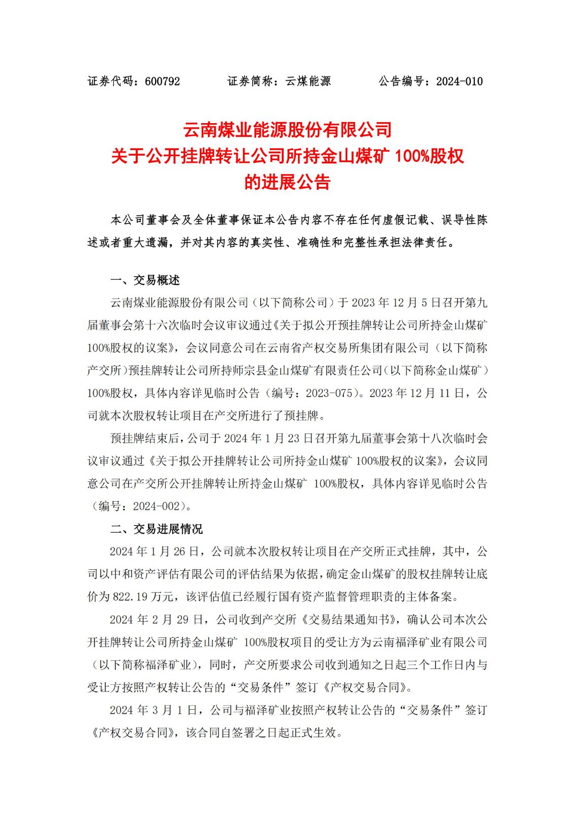 公告显示,2024年1月26日,公司就本次股权转让项目在产交所正式挂牌,其中,公司以中和资产评估有限公司的评估结果为依据,确定金山煤矿的股权挂牌转让底价为822.19万元,该评估值已经履行国有资产监督管理职责的主体备案。2024年2月29日,公司收到产交所《交易结果通知书》,确认公司本次公开挂牌转让公司所持金山煤矿100%股权项目的受让方为云南福泽矿业有限公司,同时,产交所要求公司收到通知之日起三个工作日内与受让方按照产权转让公告的“交易条件”签订《产权交易合同》。2024年3月1日,公司与福泽矿业按照产权转让公告的“交易条件”签订《产权交易合同》,该合同自签署之日起正式生效。
