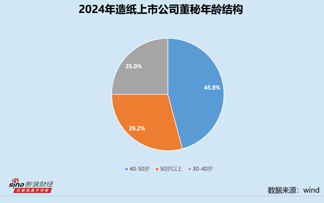 就年龄结构而言,2024年造纸上市公司董秘以中坚力量为主,剔除未披露具体信息的凯恩股份,平均年龄为45.42岁,40-50岁群体约占45.8%,50岁以上群体约占29.2%,30-40岁群体约占25.0%。结合性别分析,男性董秘占据主导地位,整体约占80.0%,平均年龄为45.79岁;女性董秘约占20.0%,平均年龄为54.73岁。