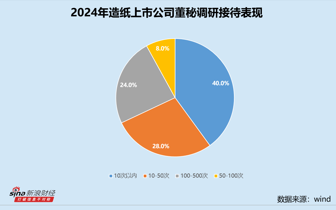 2024年,造纸上市公司接待调研未超过10次的董秘群体约占40%,其中恒丰纸业刘新欢、华泰股份任英祥、民丰特纸姚名欢、青山纸业潘其星和宜宾纸业(维权)幸志敏的接待次数为零。接待10-50次、50-100次、100-500次的董秘群体分别占比28.0%、24.0%、8.0%。民士达鞠成峰全年接待387次,平均每个工作日接待1-2次。