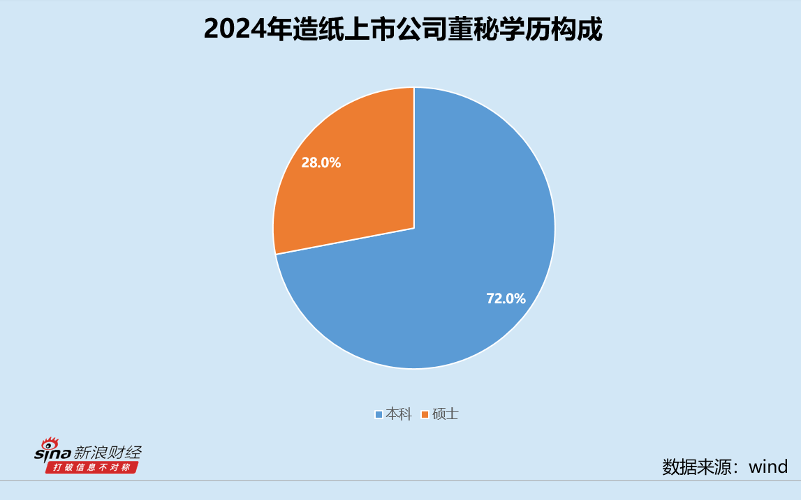 就学历构成而言,在25位造纸上市公司董秘中,本科学历约占72.0%,硕士学历则占比28.0%。