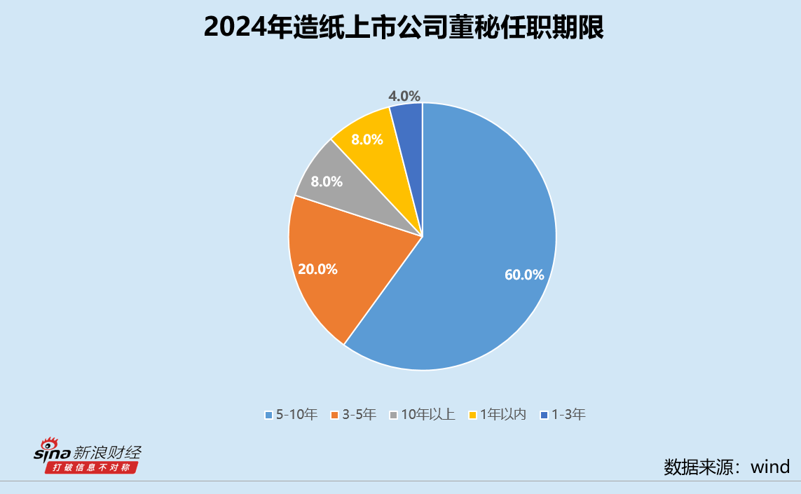 就任职期限而言,2024年造纸上市公司董秘以中长期为主,任职时间在5-10年区间的占比最高,约为60.0%;任期在3-5年的董秘群体次之,约占比20.0%;任职1-3年和10年以上的董秘群体均占比8.0%,冠豪高新任小平于2024年10月新上任。任职时间最长的是景兴纸业姚洁青,她自2001年8月开始担任董事会秘书一职,至今已超24年。