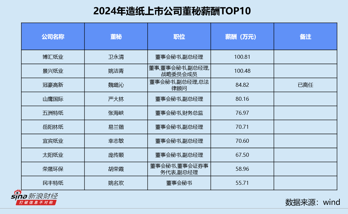 博汇纸业卫永清以100.81万元薪酬摘得第一,比第二名景兴纸业姚洁青年薪略高0.3%。财报显示,卫永清自2023年10月开始担任董秘,同时是公司的副总经理。薪酬最低且任职一年以上的董秘为恒达新材郑洲娟,报告期内从公司获得的报酬总额仅为19.99万元,且未持有公司股份,她自2016年开始担任董事会秘书兼总经理助理。