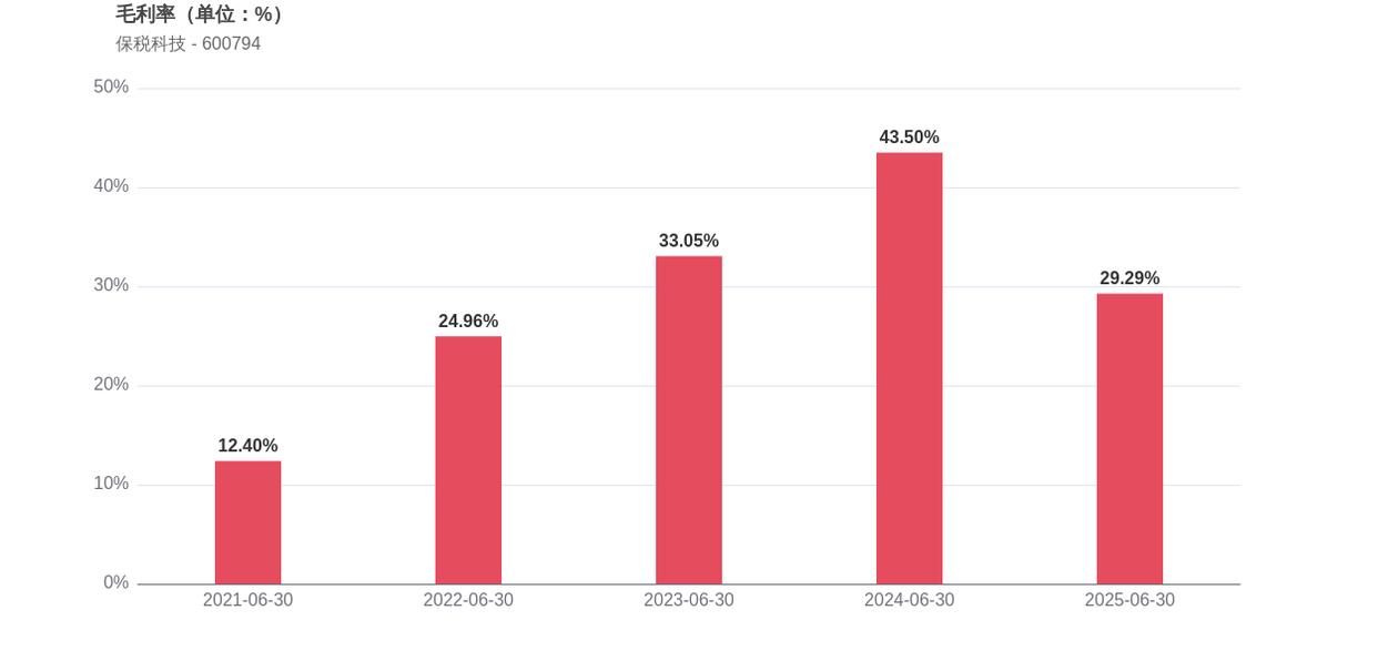 从反映盈利质量的指标来看,保税科技的净利率由2024年上半年的28.86%下滑至14.18%,下降了14.69个百分点。毛利率从2024年上半年的43.50%下滑至29.29%,下降了14.22个百分点。净资产收益率方面,2025年上半年为1.86%,同比下降了3.56个百分点。