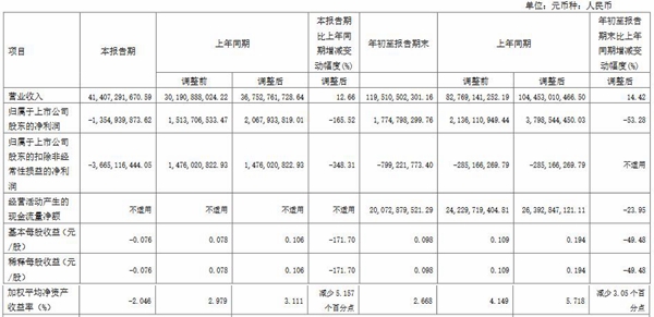 其中第三季度,公司实现营业收入414.07亿元,同比增长12.66%;实现归属于上市公司股东的净利润-13.55亿元,同比减少165.52%;实现归属于上市公司股东的扣除非经常性损益的净利润-36.65亿元,同比减少348.31%;加权平均净资产收益率-2.046%,比上年同期减少5.157个百分点。