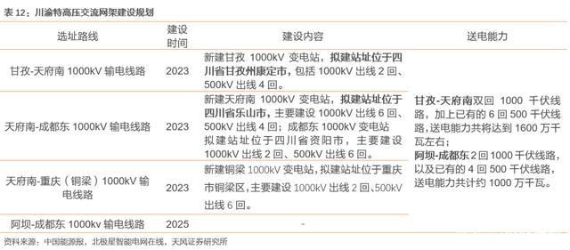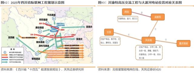(2)省内输电通道建设:四川主网建设提档升级,川渝特高压交流网架建设提速,大渡河弃水问题有望得到有效解决。根据《四川省“十四五”发展规划》,“十四五”期间四川省将推进川渝电网特高压交流目标网架建设,建成包括甘孜-天府南-成都东、阿坝-成都东、天府南-重庆铜梁的1000千伏特高压交流输变电工程,同时规划攀西电网至省内负荷中心1000千伏特高压交流输变电工程。