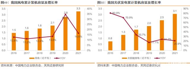 碳中和承诺驱动能源加速转型,风、光装机容量快速扩张。在一次能源消费和碳排放的双重约束下,风电累计装机规模已经由2016年1.5亿千瓦提升至2021年3.3亿千瓦,2016-2021年CAGR达17.4%;光伏累计装机规模由2016年0.8亿千瓦提升至2021年3.1亿千瓦,2016-2021年CAGR达32.1%。