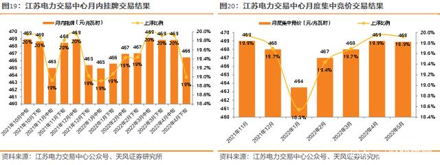 全国层面,煤价高企背景下,电价有望保持高位上浮。从2022年年度交易结果来看,江苏、广东、陕西等省成交均价均较当地燃煤基准价有所上浮。从后续的月度交易、月内交易来看,多省交易价格上浮比例仍保持较高水平。以江苏为例,其4月下旬月内挂牌交易成交均价为466.5元/兆瓦时,较当地燃煤基准价上浮19%;4月月度竞价成交均价为468.9元/兆瓦时,较当地燃煤基准价上浮19.9%。